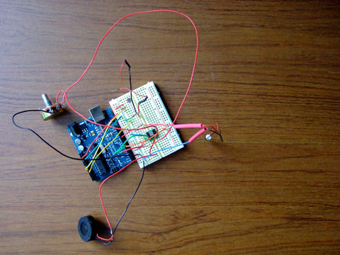 I hooked up an accelerometer, a light sensor, a piezo pressure sensor, a small speaker ripped out of a phone, a vibrating motor and a potentiometer to an Arduino. The tilt of the accelerometer controls the pitch of the speaker (with some random noise thrown in for effect), the light sensor controls the speed of the motor, the potentiometer controls the volume and the piezo can be squeezed to make a high-pitched tone in the speaker. All variables from the sensors are printed to the serial port.